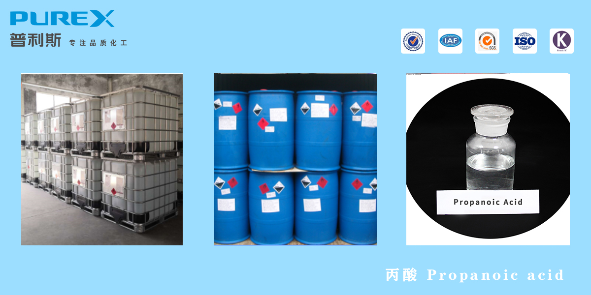 物理性質(zhì):丙酸(propanoic acid)又稱初油酸,是三個(gè)碳的羧酸,短鏈飽和脂肪酸,化學(xué)式為CH3CH2COOH。純丙酸是無色、有腐蝕性的液體,有刺激性氣味。